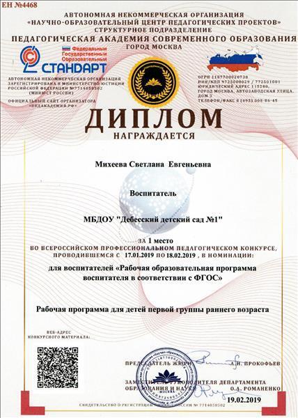Диплом за 1 место во Всероссийском профессиональном педагогическом конкурсе "Рабочая образовательная программа воспитателя в соответствии с ФГОС", 2019 год
