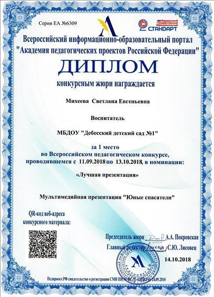 Диплом за 1 место во Всероссийском педагогическом конкурсе, в номинации "Лучшая презентация", 2018 год