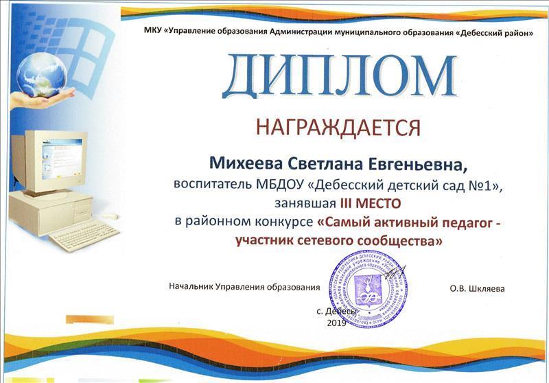 Диплом за 3 место в районном конкурсе "Самый активный педагог- участник сетевого сообщества", 2019 год