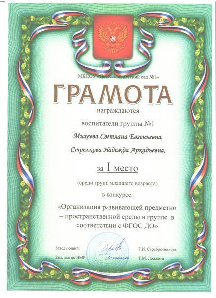 Грамота за 1 место в конкурсе "Организация предметно-пространственной среды в группе в соответствии с ФГОС ДО, 2016 год