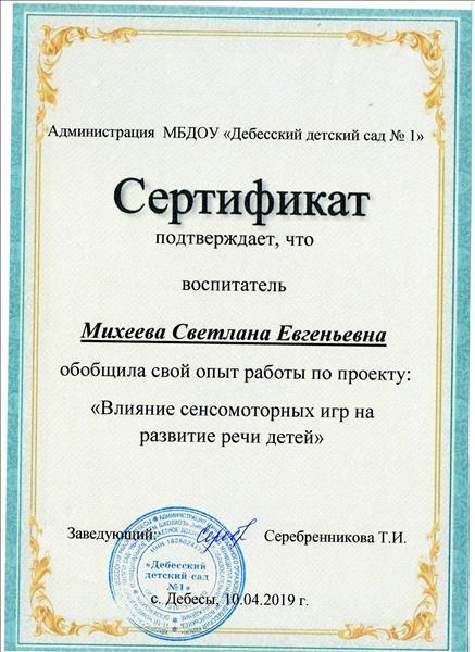 Сертификат за обобщение опыта работы по проекту: "Влияние сенсомоторных игр на развитие речи детей", 2019 год