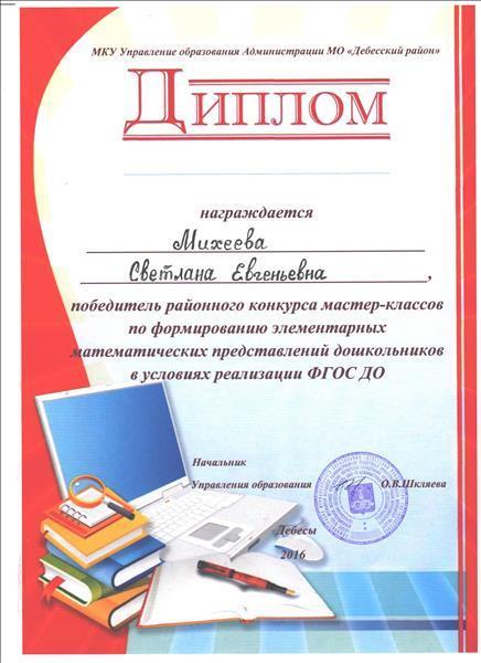 Диплом победителя районного конкурса мастер-классов по формированию элементарных математических представлений в условиях реализации ФГОС ДО, 2016 год